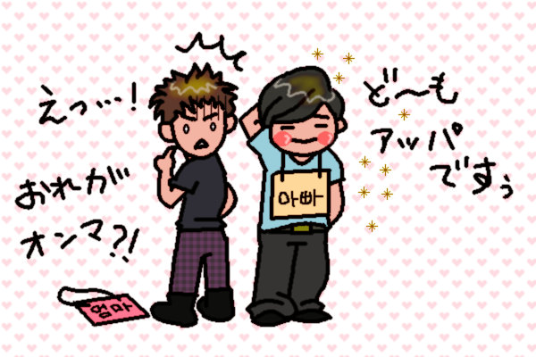 個人的に、ブリンはジェジュンに通じる乙女度だと思ってる。筋肉系乙女w てことは、SHINee内のお母さんか? しかしやね、そうするとお父さんがビミョーになっちゃうんだよなー。年齢的にはオニュなんだけど。 オニュとブリンが夫婦ってww ウケるwww オニュの空回りっぷりはユノに通じるからある意味アリかもしれんが。 長男はミンホ(異常な過保護&シスコン)で次男はKEY、末っ子で長女はテミニ。 フム。 子供の設定はこれで問題ない気がする。 しかしやっぱり夫婦の設定がなぁ・・・・しっくりこないわ。 そうはいってもお父さんがKEYてのはヘンだし(笑) むしろお母さんだしw でも、極度のマザコン次男っていう設定もアリか?!(←ひらめいた☆的な喜び) どうだろう?(どきどき) まぁとにかく、SHINee内の家族設定がいまひとつキッチリ決まらないので、なかなかネタが描けないのよねー。ざんねん。 東方神起ならいくらでも湧いてくるんだけどねぇ~^^ [追加] せっかくなので、、、 オニュ:パパ(アッパ)、ブリン:ママ(オンマ)でらくがきしてみた(笑) ブリンまさかのママ設定にびっくりw オニュ意外とパパ設定によろこぶw の図。 PR