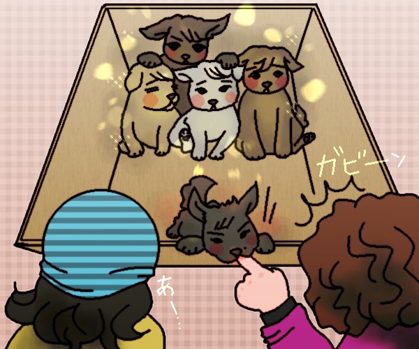 ゆきねちんからの指令 「ダンボールの隅っこの方にかたまってぶるぶる震えてる3匹(ゆちょな・じゅんす・チャミ)。その3匹を守るように寄り添って覗き込む人間をじっとにらみつける1匹(ジェジュン)と、その4匹を守るように人間に向かって吠え続ける1匹(ゆの)」 さて、どの犬が誰でしょう? クイズか(笑) 最初は犬のかぶりもので5人を描こうとしてたんだけど、犬そのものでも意外とイケるかもしれん・・・ということで挑戦してみた。 ら、意外とイケてる出来のような気がしたのでUP。 せっかくなので覗き込む人間役でゆきねちん(左側)に友情出演していただいた。 出演のオファーしとらんけど(笑) あ、友情出演だから出演料なしだよ。 ついでに監督、つまり自分(右側)もチョーシこいて出演させてみた。 監督チョーシこきすぎて噛まれとるw このあと5匹のわんこはゆきねちんが引き取り、バカ夫婦からモリモリうまれた子供は全国のともだちに里子に出されましたとさ♪ めでたし、めでたし。 PR ∴ この記事にコメントする