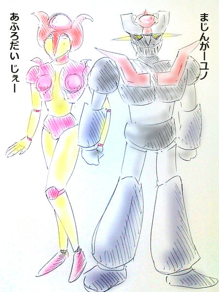ほんとか(笑) [ポチレス] Yちん> ど の 口 が 言 う か ー w アタシもマジンガーZは分かるけど、グレートマジンガーになるとチョットあやふや。 ってどうでもいい(笑) そう!ついないでるよ! だってユンジェですもの!うふw 70年代に大ヒットしたTVアニメですな。 詳細説明が必要だ!という奇特な方がいらっしゃいましたら、後日はりきって説明いたしますw 頭頂部に人間が乗り込んで操縦するという巨大ロボット マジンガーZと、それを支援するロボット アフロダイA(エースと読む)をユンジェで強引に再現・・・・しようとしたけど、ただのロボットの絵になっちゃったという。 むりやりホクロをつけたり悪あがきw アフロダイAのおっぱいはロケット砲だからドドーンと飛んでいくんだな。びっくりだねこりゃ。 JJにおっぱいはナイから再現するなら乳首なのかなー。(←ヲイ) おっぱいなのか乳首なのかは置いといて。 この2体が人類を守ってくれるなら世界は安泰だね! PR ∴ この記事にコメントする