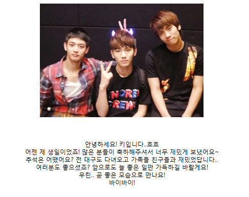 ピカピカ光るデビルカチューシャ 激かわゆすw いっそ3人でつけたらよかったのにw 안녕하세요. こんばんは 키입니다. キーです 흐흐. ふふ 어젠 제 생일이었죠. 昨日は ぼくの 誕生日でした 많은 분들이 축하해주셔서 너무 재밌게 보냈어요~ たくさんの方が祝ってくれて とても楽しく過ごしました~ 추석은 어땠어요? 秋夕はどうでしたか? 전 대구도 다녀오고 가족들 친구들과 재밌었답니다. 以前 大邸(テグ)に行って 家族や友達と楽しんできました 여러분도 좋으셨죠? 皆さんは どうだったかな? 앞으로도 늘 좋은 일만 가득하길 바랄게요! これからも よいことがいっぱいありますように! 곧 좋은 모습으로 만나요! じゃあまた かっこいいボクと会おうね! 바이바이 バイバイ PR